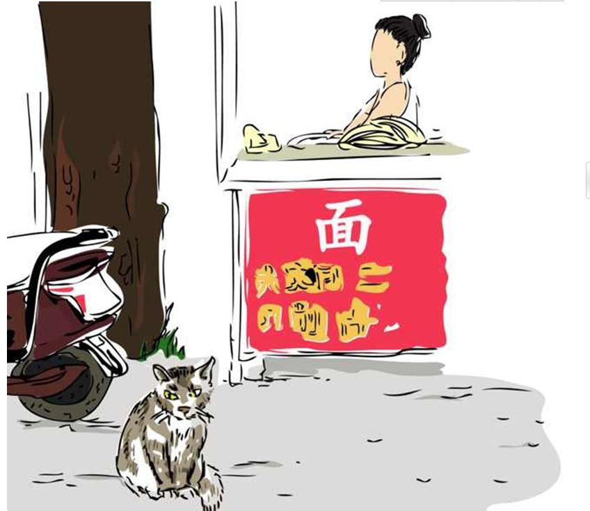 道北村中的一家面食店,店主在制作新鮮的面條,小貓?jiān)跇涫a下乘涼